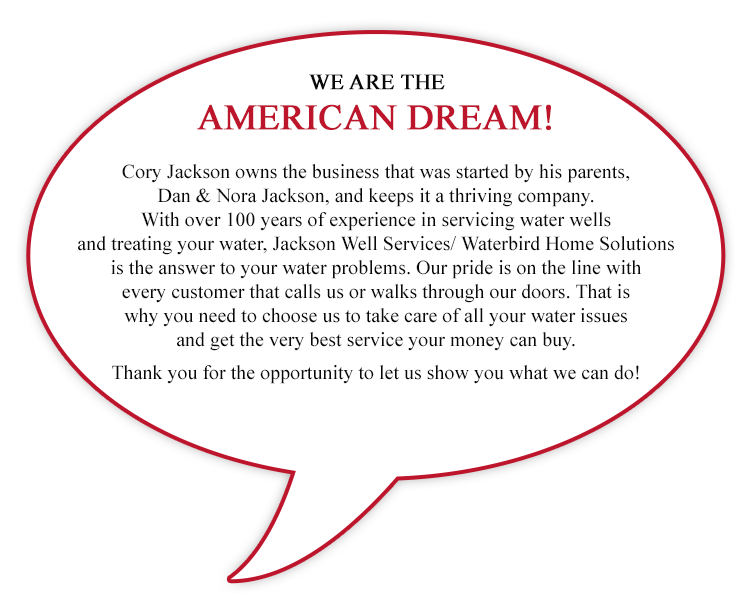 "Cory, I just wanted to personally thank you and never have really had the chance. A couple of years ago our well “fried” and we were broke as Rod was out of work. It happened the night before our daughter’s graduation… horrible timing. We spoke to Jim at awards night (we showed up without having a shower… YUCK!) and he talked with your dad… and before we knew it there were Jackson & Son trucks in our driveway…. What a blessing!!!!! Not only did we have water back in less than 24 hours… You guys carried us that summer while we made payments. You never sent us a bill or charged a penny interest…. THANK YOU!!!!! We sure appreciated it…. nothing like "hometown families"!!!!!"